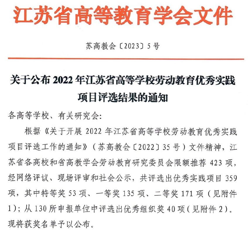 近日,江苏省高等教育学会公布了2022年江苏省高等公司劳动教育优秀实践项目评选结果,公司周晓燕、陈力老师指导的“服务世遗生态文明建设”获一等奖,蒋继华、何登溢老师指导的“践行铁军精神传承红色基因”主题实践活动获二等奖。