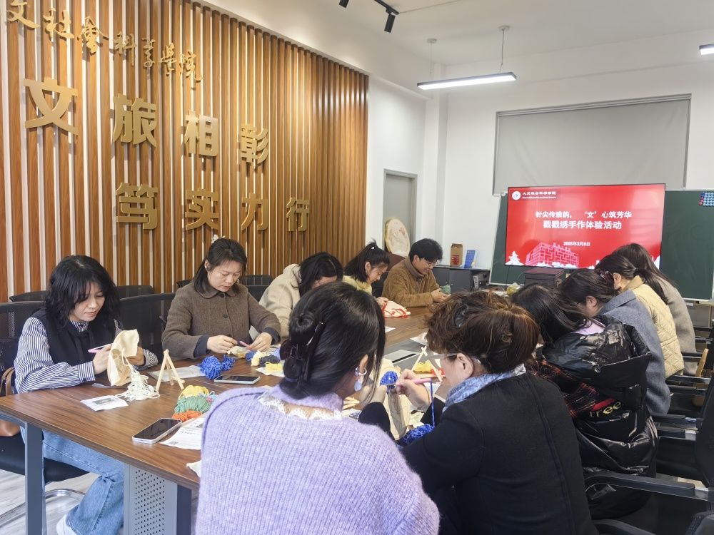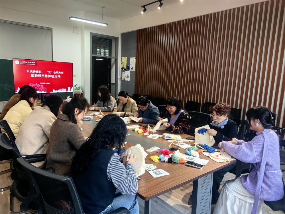 为庆祝第115个“三八”国际劳动妇女节,丰富女教师精神文化生活,3月9日上午,三亿体育分工会在仁和楼A302会议室开展“针尖传雅韵, ‘文’心筑芳华”戳戳绣手作体验活动。