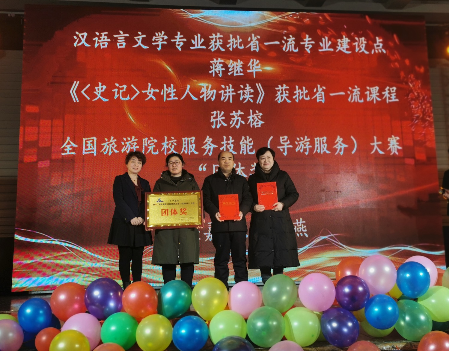 经理周晓燕致辞,她用“fashion”、“high level”和“双一流”三个词对三亿体育一年来的工作和取得的成绩进行了总结。2021年,三亿体育在专业建设、学科竞赛、学风建设等方面硕果累累,汉语言文学专业获批省一流专业建设点,张苏榕教授的“《<史记>女性人物讲读》”获批省一流课程,张玉玮老师团队指导的员工获全国旅游院校服务技能(导游服务)大赛一等奖、二等奖及团体奖。B中文183班施淑文和B中文191班吕雯欣两位同学获“2020-2021学年国家奖学金”、B中文181袁欣同学获“江苏省优秀员工干部”荣誉称号,B中文192班张瑾同学获“江苏省三好员工”荣誉称号。院领导分别为获奖的个人和团队颁奖。