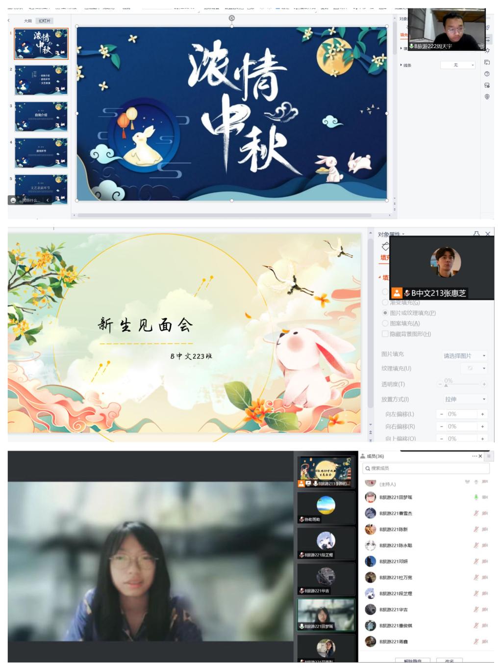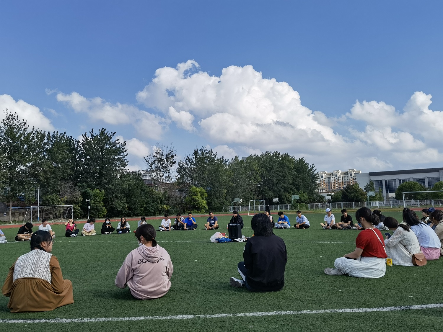 中秋主题文案征集活动中,人文学子们充分发挥专业特长,精心创作与中秋相关的诗词短句,以表达自己的中秋之感,思家之情。新生中秋线上联谊会中,各班级的同学们通过视频自我介绍,互相认识,畅谈自己的成长经历和家乡特色,进一步增进同学之间的了解。同学们还围绕中秋主题,一起探讨中秋节的起源、家乡习俗、诗歌等,并彼此发送中秋祝福,欢声笑语,其乐融融。户外素质拓展活动中,新生辅导员乐珮珮和21级学长学姐们带领各班级的新生代表,在建军东路校区的操场上进行了中秋主题“飞花令”、“猜谜”、“数字炸弹”、“抱团喊数”等破冰游戏,同学们热情高涨,积极参与。活动中设置了才艺表演环节,同学们竞相上台,各展才华,表演了唱歌、舞蹈、相声等形式多样、内容丰富的精彩节目,B中文221邢濠同学的吉他弹奏《但愿人长久》,歌曲婉转悠扬,承载了演唱者心中美好的愿景,更是赢得了同学们的阵阵掌声。活动最后,同学们纷纷拿出手机拨通远方亲人的电话,表达了对亲人的思念,分享在校生活以及对未来老员工的美好憧憬。