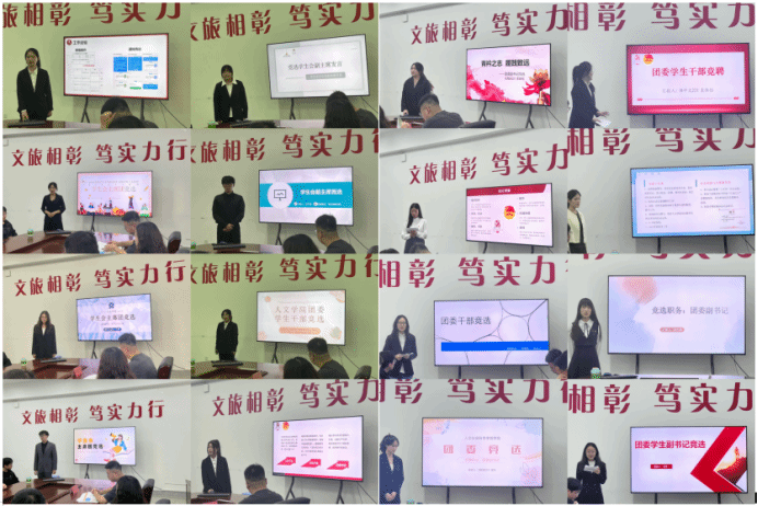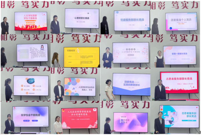 本次换届面试共有32位来自团学组织各部门的竞选者参加。他们依次上台,结合自己的工作情况,以PPT的形式从自我介绍、任职经历、竞选优势、工作规划等方面进行3分钟的竞选演讲。竞选者们大方自信、沉着稳健、言语流畅、思维缜密,充分彰显了人文学子昂扬向上的精神风貌和甘于奉献的青春担当,赢得了在场师生的阵阵掌声。