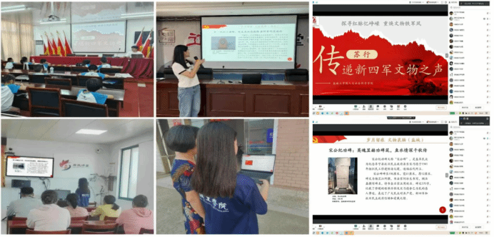 实践初期,成员们通过查阅新四军革命历史及文物相关的文献档案、新闻报道、视频纪录片等形式,整理挖掘宋公碑、“娃娃剧团”党旗、宋泽夫遗稿《喜鹊》等一系列具有代表性的新四军革命文物,以此建立新四军典型革命文物台账,为开展实践提供坚实的材料支撑。7月13日,实践团邀请南京晓庄公司马克思主义公司“小红灵”实践团师生代表来校开展交流研讨。会上,南京晓庄公司马克思主义公司团委书记王翼凡向大家介绍了公司特色实践团“小红灵”的基本情况,并就实践团历年开展的红迹寻访调研实践活动以及实践成果转化等方面进行经验分享。双方师生围绕“新四军革命文物活化实践”“新四军革命精神传承”“红色实践活动开展形式”等方面开展交流探讨。此次交流活动进一步完善了实践团成员的知识储备,为后续活化新四军革命文物、再现文物“红色基因”提供了思路借鉴。