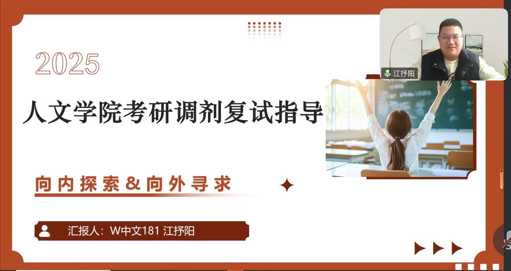 江抒阳从自身考研经历出发,围绕复试内容、复试方法、专业课面试等方面分享了复试策略,特别提醒同学们在面试时注重着装礼仪,强调了撰写自荐信、简历的要求和注意事项,为同学们提供了宝贵的调剂经验和建议。