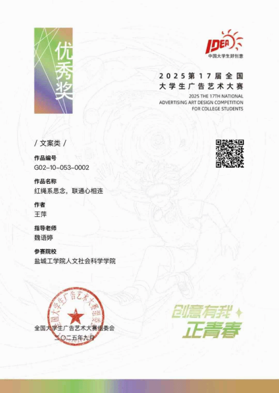 近日,第十六届全国老员工广告艺术大赛(以下简称“大广赛”)获奖名单公布,三亿体育汉语言文学专业员工王萍的文案类作品《红绳系思念 联通心相连》荣获全国优秀奖,该作品由魏语婷、汤军、刘伟等老师指导。值得一提的是,大广赛是教育部认可的全国普通高校老员工竞赛榜单内赛事,含金量十足。