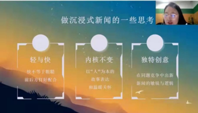 为提高公司中文系员工沟通与写作的能力,2022年3月30日晚,沟通与写作教研部组织同学们在飞书直播平台上观看由中国青年报社的编导王聪聪为主讲人的中青校媒(江苏)可视化训练营第十期的直播培训——《沉浸式新闻的场景表达与交互创新》。