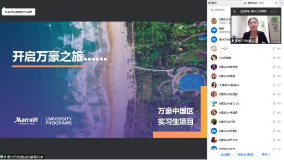 16位高管分别来自万豪旗下的酒店、驿都金陵大酒店、启东国瑞豪生大酒店和盐城迎宾馆的人力资源部、市场销售部、礼宾部、前厅部、餐饮部等。在主题讲座环节中,他们分别就以下专题作了精彩的主题演讲:《万豪智能及数字化运用》、《酒店人职业规划》、《酒店新媒体营销》、《国际品牌酒店在中国的发展前景以及对旅游、酒店管理专业员工的期望》、《酒店人的多元化生活》、《酒店待客艺术》、《酒店行业的人才发展策略》、《酒店常见客诉和客人需求分析》、《酒店沉浸式体验营销方式》、《酒店人的职业素养》、《酒店餐饮总监的成长历程》、《职业规划与Z世代择业趋势的话题》、《酒店人的“待客之道”》、《用心服务感动客户》、《电影中的“酒店”》、《中国民族品牌的特点—以金陵为例》。