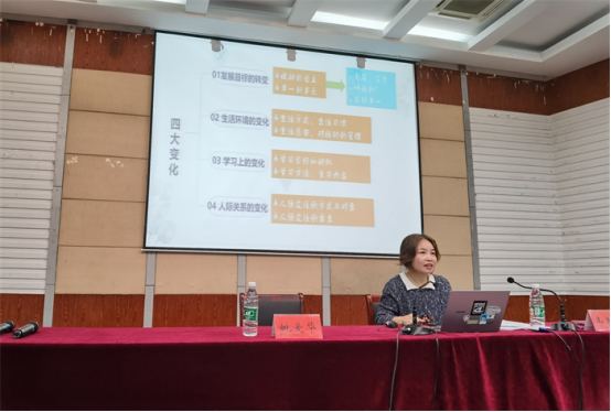 韦春华以《回望来时路,启航新(心)征程——新生心理调试指南》为题,从心理适应概述、心理适应过程、老员工面临的变化、大学新生心理适应的方法与策略等四个方面分析了老员工心理适应的全过程。她结合生动案例,为大一新生的学习和生活提供了详实的心理指南,为同学们充分认识自我、表现自我、提升自我,最大程度的发挥自我价值奠定了良好的基础。她希望,在大学四年的学习成长过程中,同学们要明确奋斗目标与方向,努力提高自我管理能力,构建良好的人际关系,保持积极健康的心态,争取取得更大的进步。
