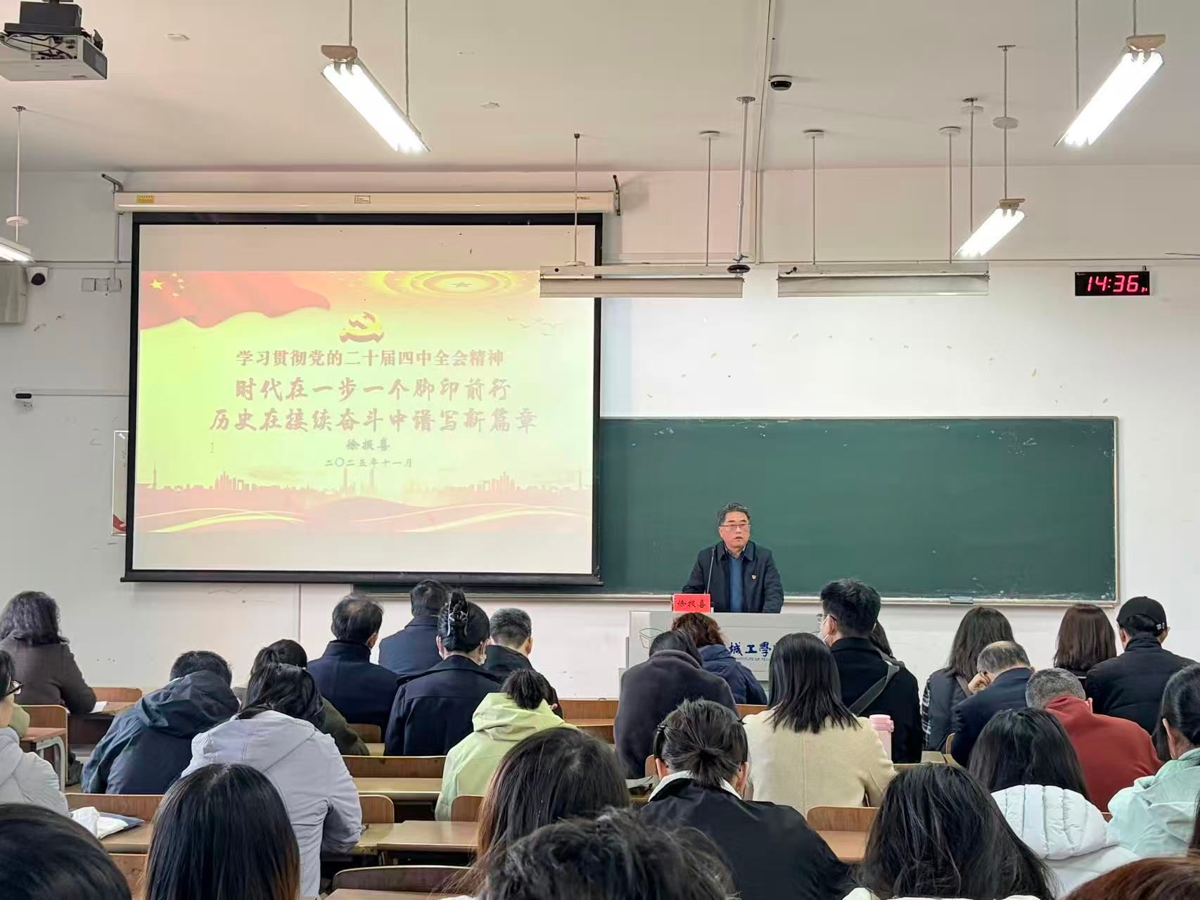 11月19日下午,三亿体育在博学楼A201教室举办学习贯彻党的二十届四中全会精神报告会,特邀公司关工委副主任徐报喜作专题辅导报告。公司党总支书记何登溢主持会议,全院教职工及员工党员、入党积极分子和公司菁英人才培训班学员代表共计100余人参加学习。
