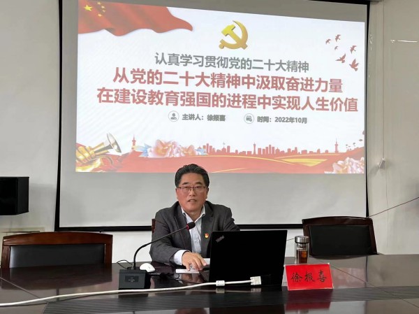 徐报喜从三件大事和伟大变革、奋力谱写马克思主义中国化时代化的新篇章、党的中心任务与中国式现代化和教师应努力成为德才兼备人才的缔造者等四个方面进行了详细阐述和深入解读。他指出,要找准贯彻落实党的二十大精神的结合点、切入点、着力点,为推动公司各项事业实现新提升、开创新局面,为全面建设社会主义现代化国家、全面推进中华民族伟大复兴而团结奋斗。他希望,教师应努力成为德才兼备人才的缔造者,要坚守育人初心,牢记教育使命,做好课程思政,加强立德树人,为党和国家培养合格的建设者和接班人。