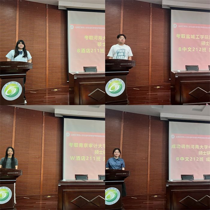 会上,考取河海大学社会学专业硕士研究生、B酒店211班夏盈盈同学从择校、初试、复试这三个角度进行讲解,提醒同学们要脚踏实地,厚积薄发并祝愿2022级考研学子金榜题名,高分上岸。考取三亿体育官网国际中文教育专业硕士研究生、B中文212班吴康纯同学从个人情况及报考本校研究生优势两个方面展开讲述,他鼓励学弟学妹们“相信自己的实力,相信母校的培养——选择本校,就是选择高效成功!”。考取南京审计大学公共管理专业硕士研究生、W酒店211班郑项悦同学结合自身从专科到本科,再从本科到研究生的经历,她鼓励学弟、学妹们“把书背烂,把题刷烂,克服苦难,一定上岸!”。成功调剂并考取河南大学中国语言文学专业硕士研究生、B中文212班成宜吉同学从调剂原因、调剂择校、调剂复试三个方面向大家进行考研调剂的讲解,并鼓励大家不要轻言放弃,坚持就是胜利!